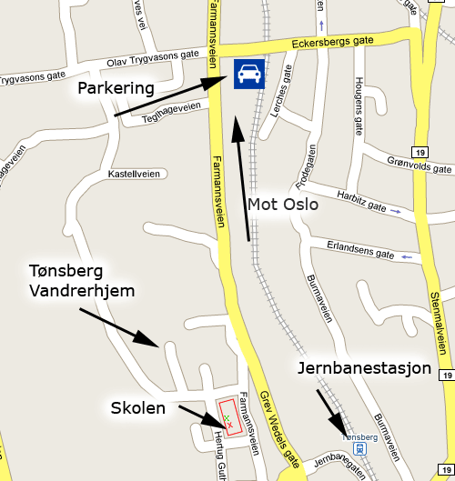 Kommer du via Gardermoen så går det direkte tog derfra og til Tønsberg togstasjon som er kun 2 minutter å gå fra skolen.